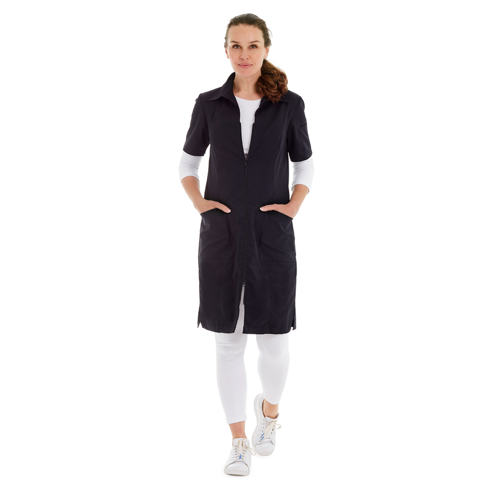 Rock- klänning i klassiskt snitt. Figursydd modell i behagligt stretchtyg och tvåvägsdragkedja. Kan med fördel bäras öppen som en rock eller stängd som en klänning. Sprund i ryggen för full rörelsefrihet. Litet sprund i sidorna, lätt sluttande fickor framtill, skjortkrage, kort ärm och en liten pennficka på ärmen.
