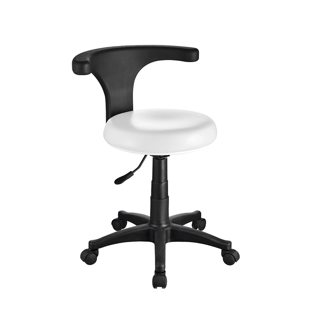 En arbetsstol i extra lågt utförande med ett U-format ryggstöd som du kan rotera 360 grader. Fungerar både som ryggstöd och armstöd, sittdynan är klädd i vitt konstläder. Underredet är mattsvart.