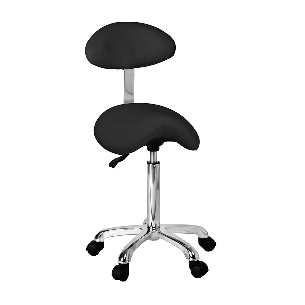 Bekväm sadelstol klädd i konstläder med ryggstöd och kromat underrede. Lämpar sig bra till terapeuter som arbetar med t ex hudvård.