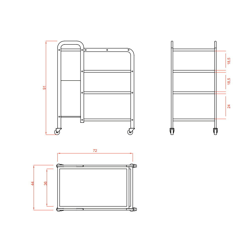 Avlastningsbord med 4 plan, hjul och sidokorg.