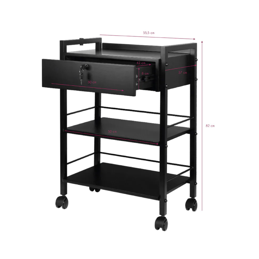 Avlastningsbord med generösa ytor. Har en låsbar låda samt är försedd med hjul som underlättar förflyttning. Även utrustad med en hållare för lupplampa