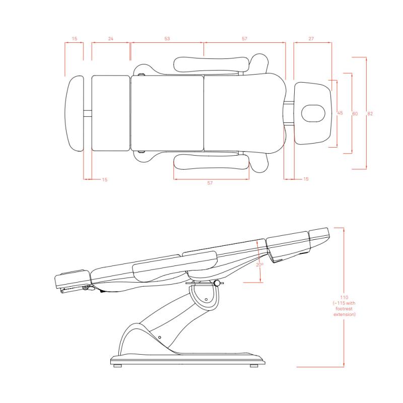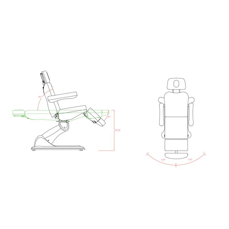 En praktisk och exklusiv behandlingssäng / behandlingsbänk med 4 motorer samt rotationsmöjlighet (240°). Motorerna styr höjning/sänkning av sits, ryggstöd, benstöd samt tippning av sittdyna. Motorerna och rotationsmöjligheten underlättar ergonomin för terapeuten. Inbyggda reglage i stol samt på fotstöd gör regleringen av bänken enkel. Denna behandlingsbänk har inbyggd återställningsfunktion (RESET) vilket innebär att du med en lätt knapptryckning får tillbaka bänken i sitt ursprungsläge (nollposition) samt 2 st memoreringsknappar. Integrerade fotpedaler i fotdelen. Vita mjuka dynor med hög komfort och kvalité. Inbyggd värme i dynorna finns som tillval.