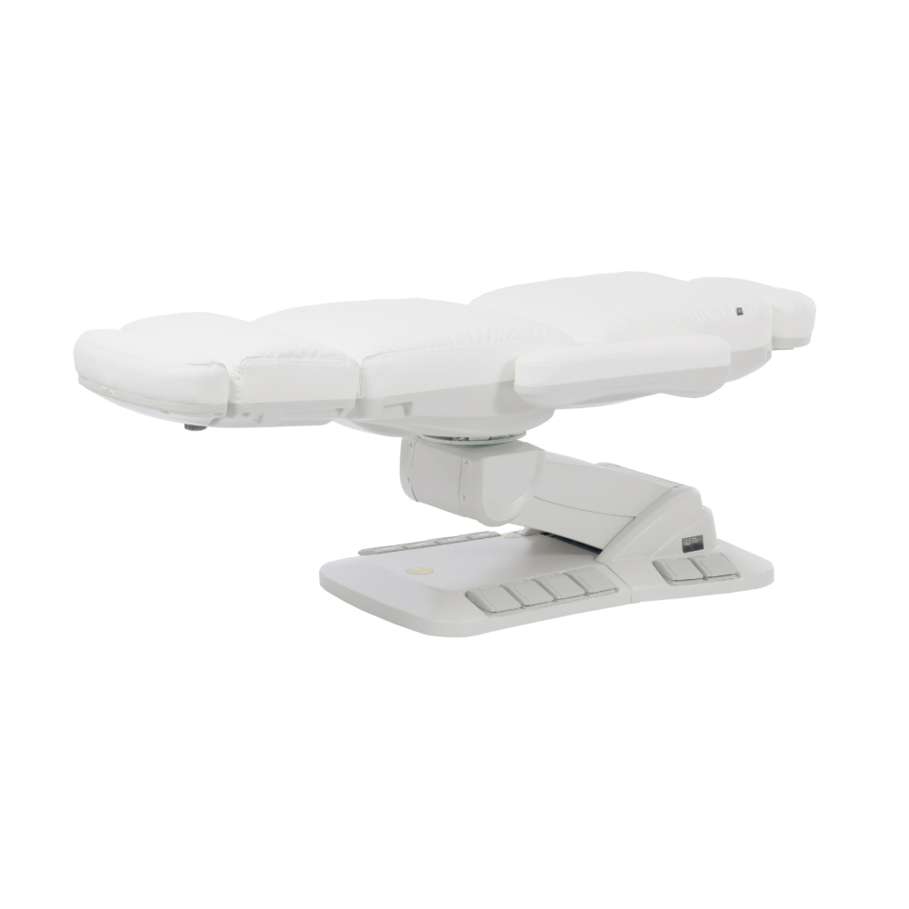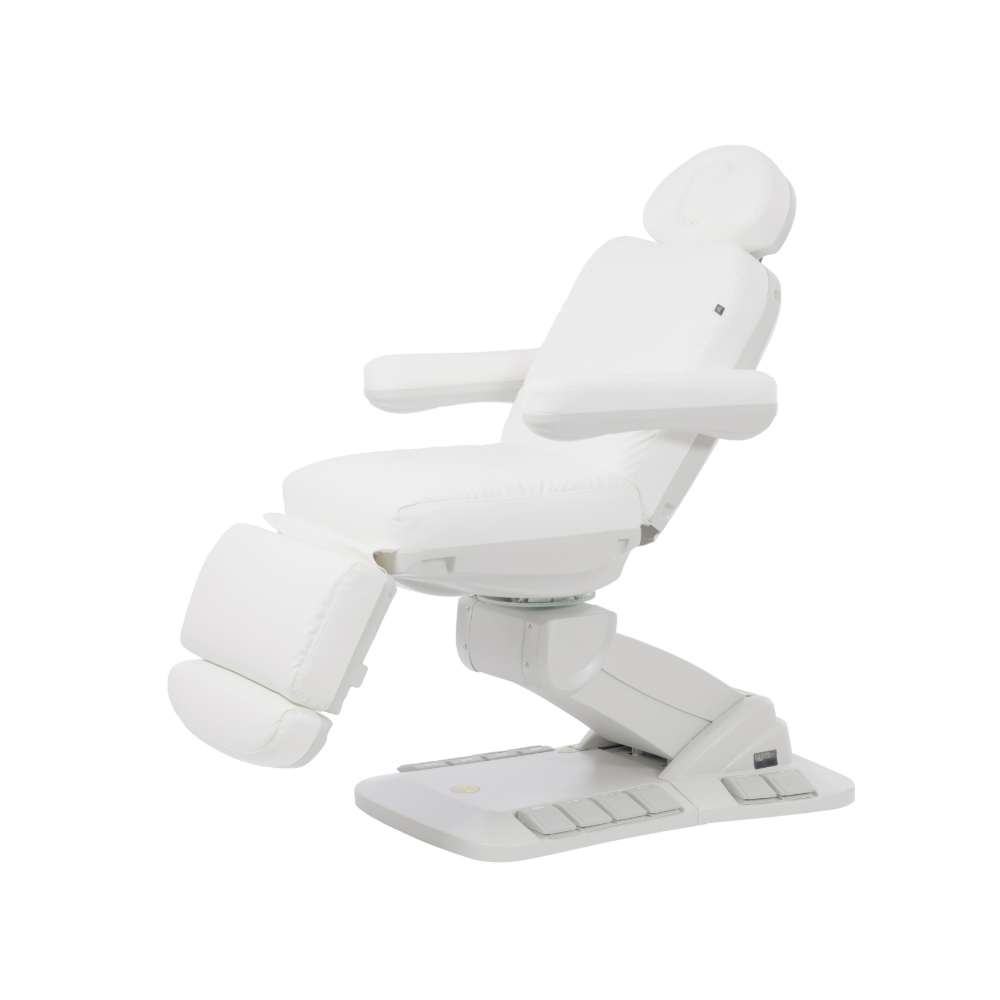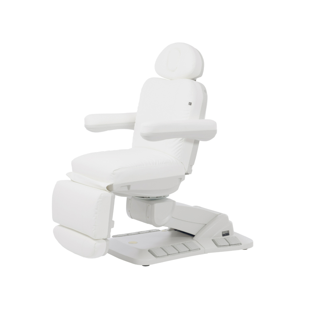 Avancerad behandlingsstol med en mycket stabil struktur, speciellt utformad för att optimera arbetsytan tack vare sitsens 90° rotation. Den har fyra motorer som styr höjd, ryggstödslutning, sitslutning och fotstöd. Fällbara armstöd. De integrerade kontrollpanelerna och fotpedalerna ger full rörelsekontroll från valfri punkt på stolen. Inkluderar säkerhetslåssystem och reset-funktion för att återgå till utgångsläget. Andningshål i huvudkudden.