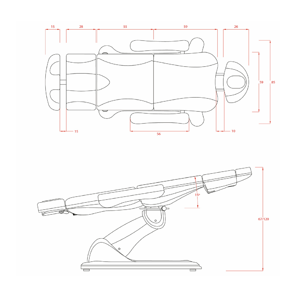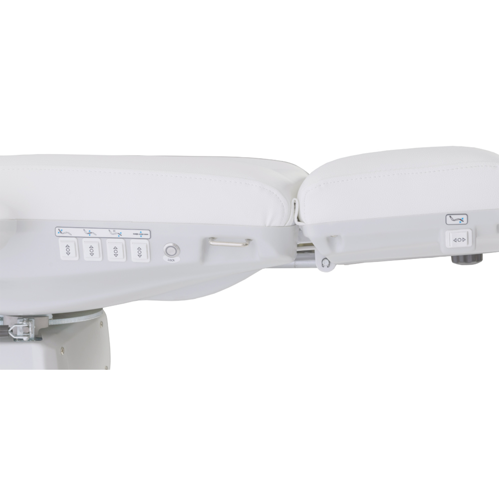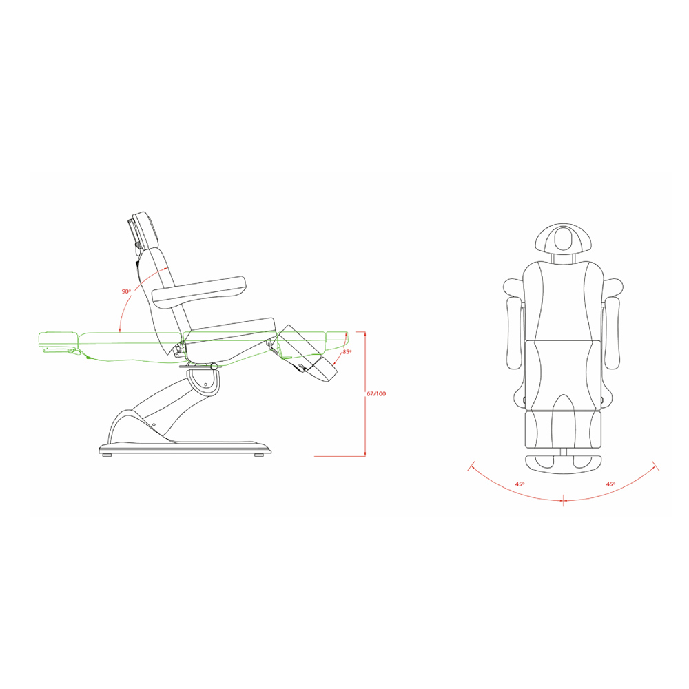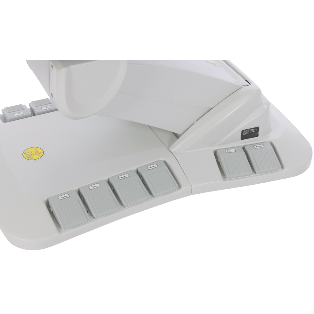 Avancerad behandlingsstol med en mycket stabil struktur, speciellt utformad för att optimera arbetsytan tack vare sitsens 90° rotation. Den har fyra motorer som styr höjd, ryggstödslutning, sitslutning och fotstöd. Fällbara armstöd. De integrerade kontrollpanelerna och fotpedalerna ger full rörelsekontroll från valfri punkt på stolen. Inkluderar säkerhetslåssystem och reset-funktion för att återgå till utgångsläget. Andningshål i huvudkudden.