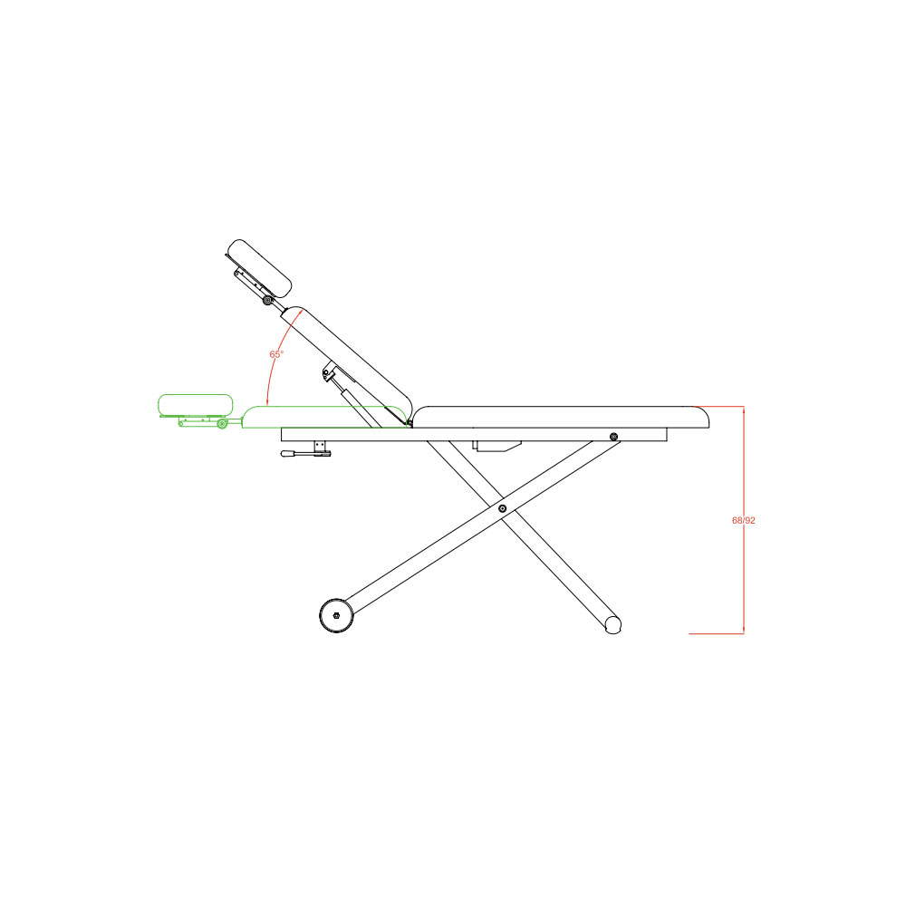 Tvådelad behandlingsbrits med en stabil konstruktion som lämpar sig väl för olika kropps- och hudbehandlingar. Går att höja och sänka med hjälp av motor. Styrning av motor finns inbyggt på sängens ram. Huvuddelen höjs med hjälp av en spak. Två låsbara hjul möjliggör lättare förflyttning av behandlingssängen.