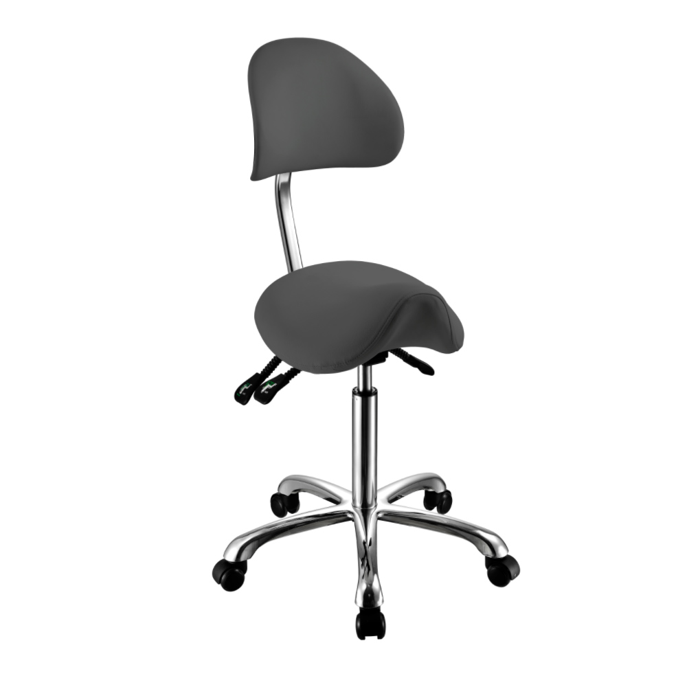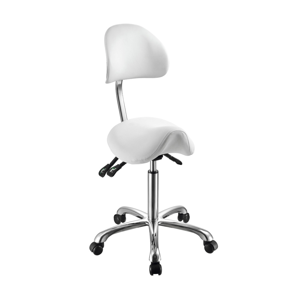 Skön och snygg sadelstol med ryggstöd. Kan regleras i olika lägen för mer ergonomisk ställning. Finns i färgerna: vit, grå och svart.