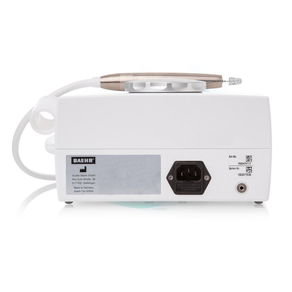 Upplev en helt ny arbetsupplevelse med handstyckets integrerade vatten-/luftkylsystem, vilket garanterar en behaglig handkänsla utan värmeutveckling. TEC S 2000 har 10 lysdioder på handstyckets spets som lyser upp arbetsområdet på foten perfekt utan skuggor. Handstyckets mikromotor genererar upp till 40 000 kraftfulla varv per minut med en knapptryckning, i steg om 1 000 varv/min eller direkt valbart – om så önskas, steglöst variabelt med den valfria fotpedalen. Naturligtvis är den helt vibrationsfri. Den har tre MEMORY-knappar för att spara individuella inställningar.